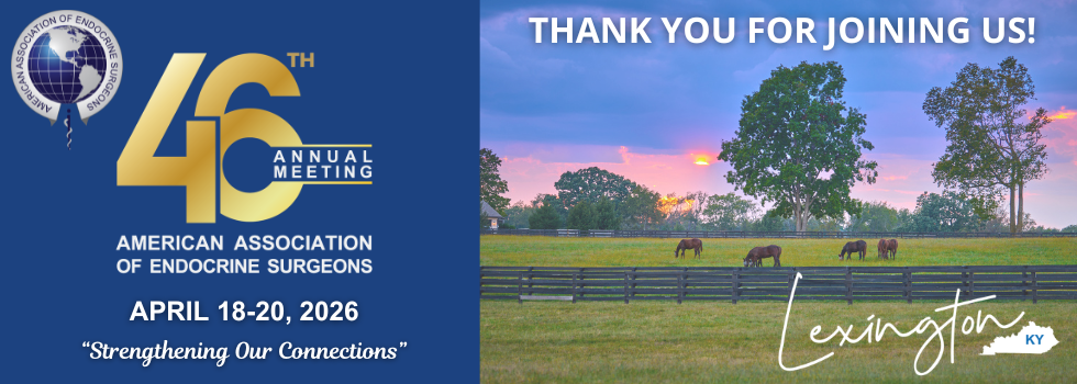 Register Now for the AAES 2026 Annual Meeting - join us in the Horse Capital of the World®!The American Association of Endocrine Surgeons 46th Annual Meeting will take place April 18-20, 2026 in Lexington, Kentucky. Learn more about the Annual Meeting, the program, speakers, sponsors, things to do in Lexington and more! Registration and the AAES hotel block is now open! View the 2026 Meeting Website